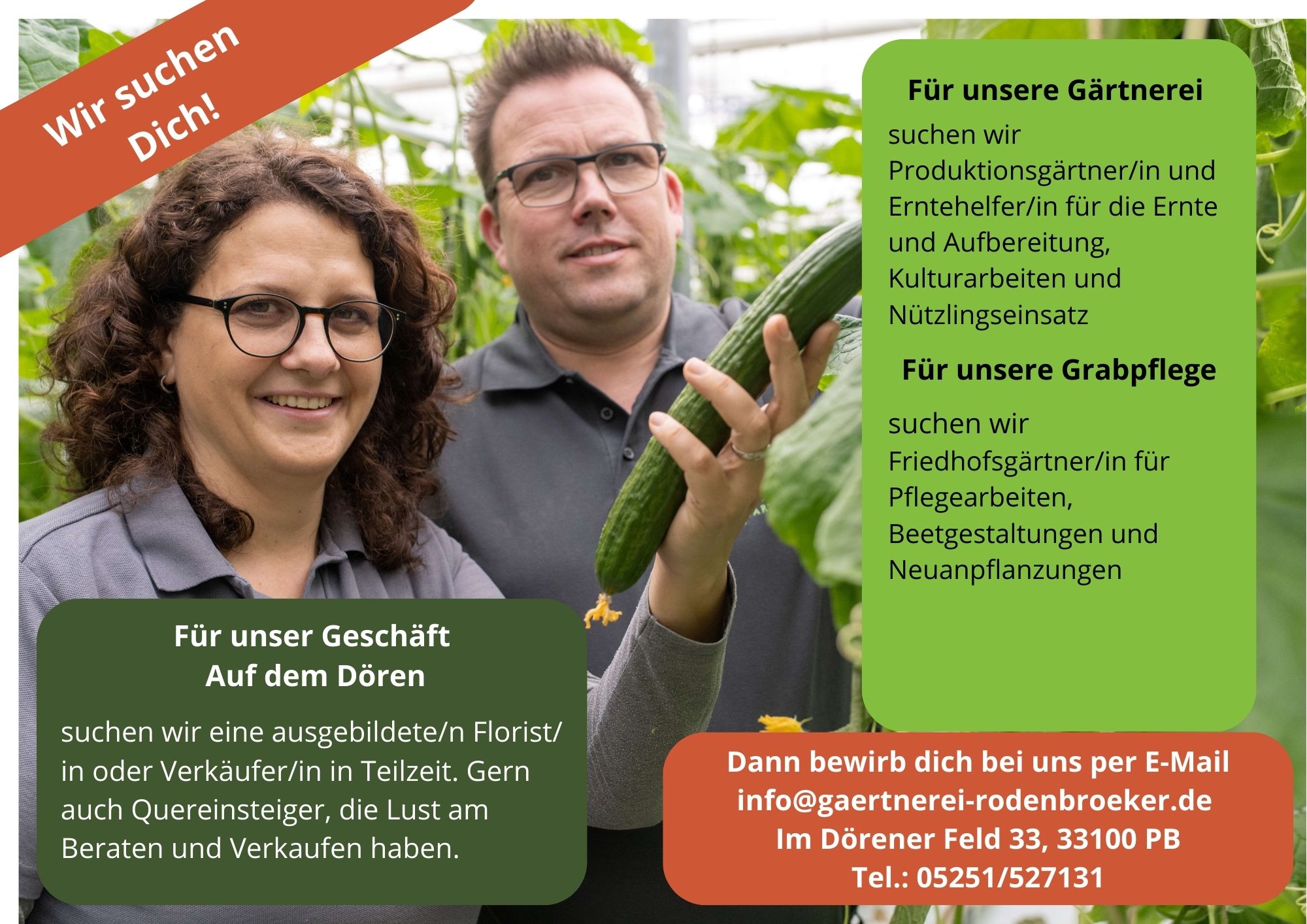 1946 wurde die Gärtnerei in der Stadtheide gegründet. 1973 siedelte der Betrieb zum Dören unter der Leitung von Maria und Hans-Hubert Rodenbröker. In dritter Generation stehen nun Beate Rodenbröker und Jens Höschen für einen der modernsten Gartenbaubetriebe in Paderborn. Vieles ist ausschließlich Handarbeit, wird aber immer mit der neusten Technik unterstützt.